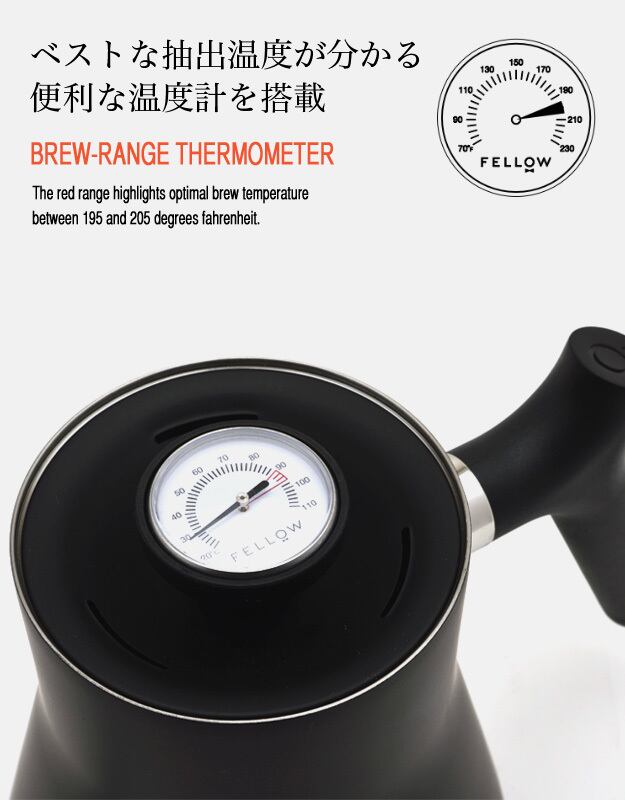2016年のデビューから間もなく、コーヒーに関わる専門業者をはじめ多くのバリスタやコーヒーマニアを魅了する、サンフランシスコ発のFELLOW(フェロー)社のStagg Pour-Over Kettle(スタッグ ポアオーバーケトル)。ハイグレードのステンレス鋼を使用し、美しく磨き上げたボディと洗練された無駄のないシルエットはお手持ちのキッチンアイテムやインテリアとも相性抜群。電気コンロ、ガスコンロ、IHクッキングヒーターでお使いいただけます。